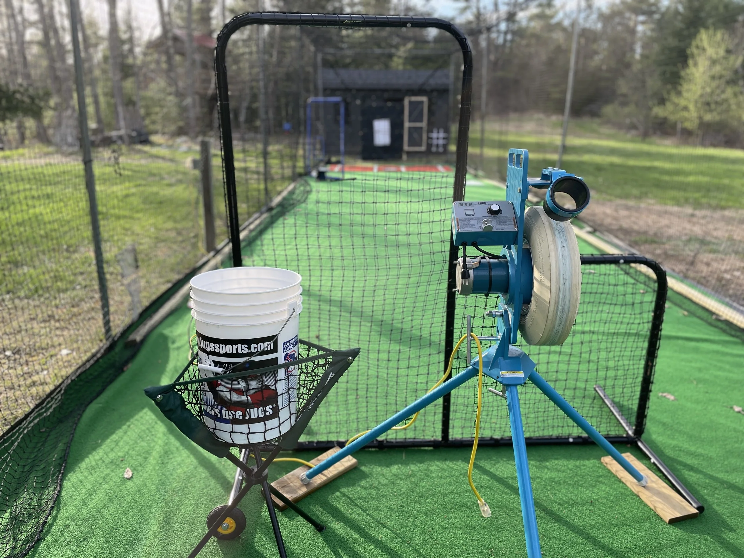 15’ x 70’ x 12’ high batting cage. Includes Jugs MVP Pitching machine, batting tees, l-screens and a bucket of 5 dozen baseballs.