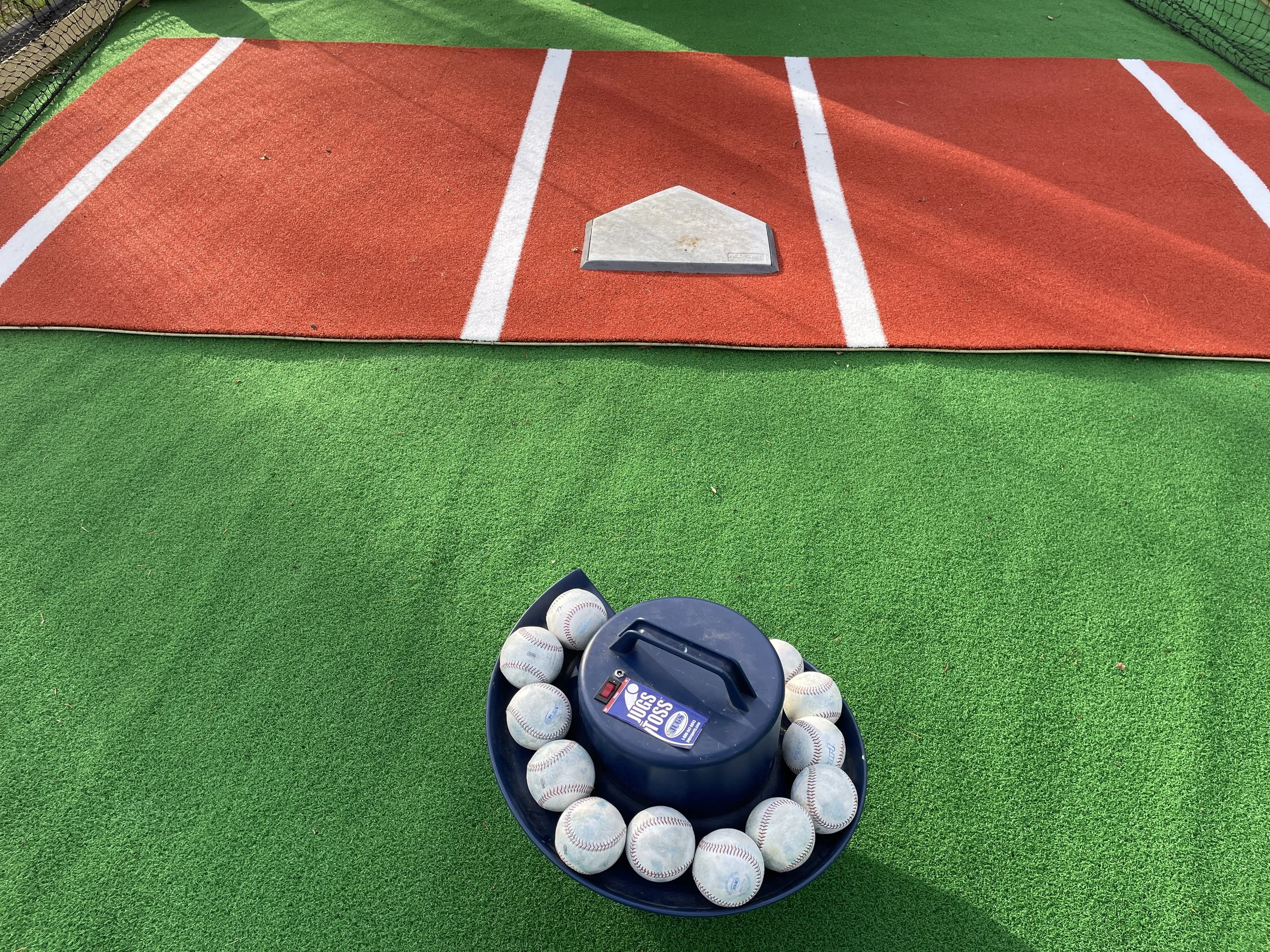 15’ x 70’ x 12’ high batting cage. Includes Jugs soft-toss machine, batting tees, l-screens and a bucket of 5 dozen baseballs.